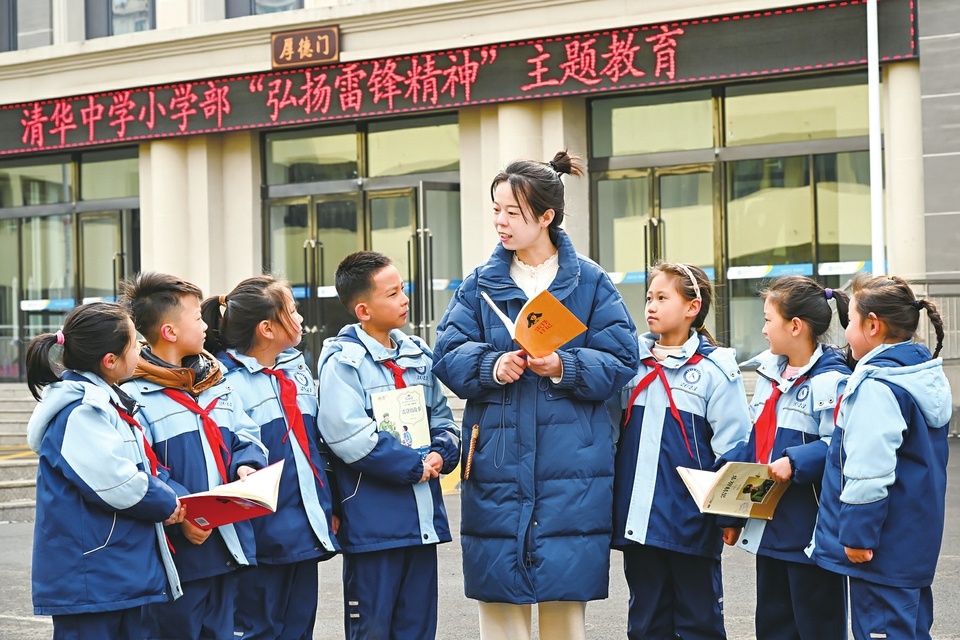 3月4日,长治市潞州区清华中学开展的主题教育活动上,小学部思政教师宋婷给小学生们讲解雷锋故事(梁栋 摄)